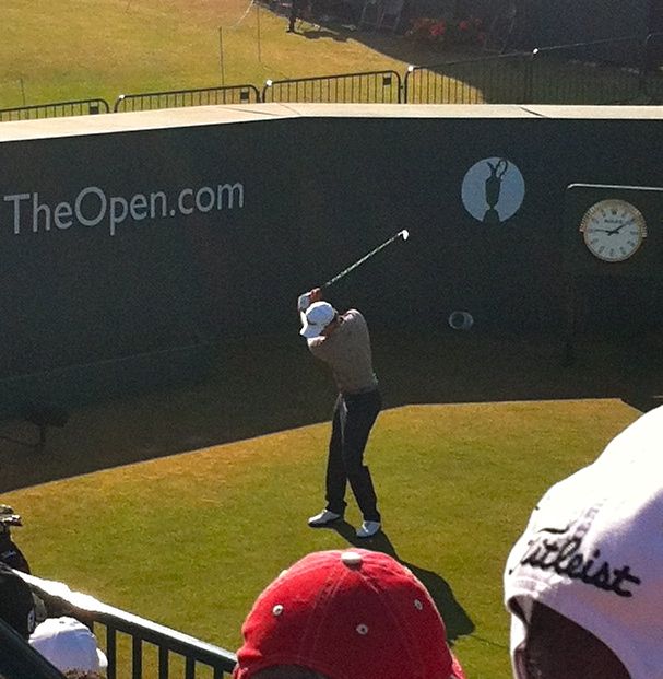 We got in at 11:30pm on Thursday night and woke up bright and early to take the train and the shuttle out to Muirfield. We wandered around a bit and then went over to the first tee to watch the big timers tee off, and to hear the announcer with the funny voice. (Shout out to Peter B. who Drew kept trying to take a video for. They love this guy.)